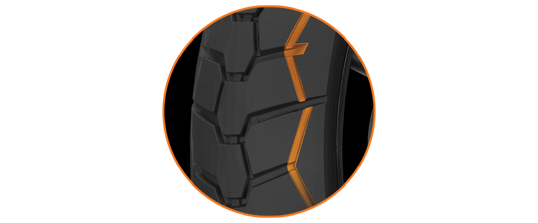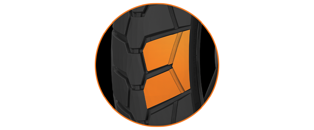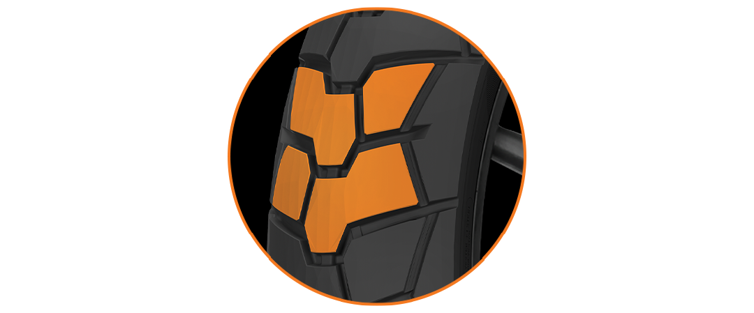 The unique shaped block, extended across the tread profile for improved handling.